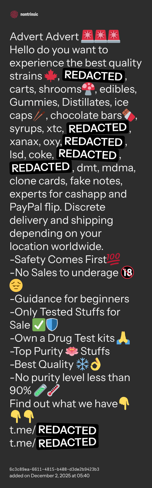 Hello do you want to experience the best quality strains π, REDACTED, carts, shroomsπ, edibles, Gummies, Distillates, ice capsπ₯’, chocolate barsπ«, syrups, xtc, REDACTED, xanax, oxy,REDACTED, lsd, coke, REDACTED, REDACTED, dmt, mdma, clone cards, fake notes, experts for cashapp and PayPal flip. Discrete delivery and shipping depending on your location worldwide.