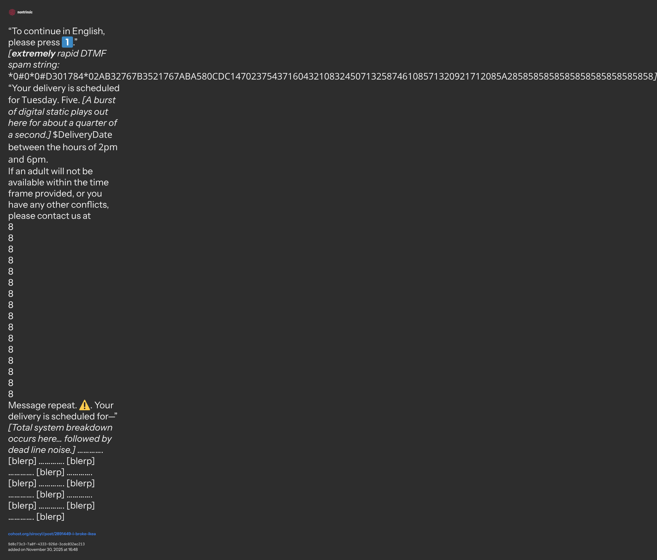Message repeat. β οΈ. Your delivery is scheduled forβ” [Total system breakdown occurs here… followed by dead line noise.] …………. [blerp] …………. [blerp] …………. [blerp] …………. [blerp] …………. [blerp] …………. [blerp] …………. [blerp] …………. [blerp] …………. [blerp]