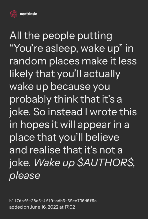 ๐ค shareAll the people putting “You’re asleep, wake up” in random places make it less likely that you’ll actually wake up because you probably think that it’s a joke. So instead I wrote this in hopes it will appear in a place that you’ll believe and realise that it’s not a joke. Wake up $AUTHOR$, please