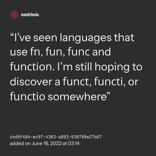 ๐ค share“I’ve seen languages that use fn, fun, func and function. I’m still hoping to discover a funct, functi, or functio somewhere”
