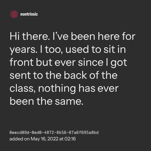 π€ shareHi there. I’ve been here for years. I too, used to sit in front but ever since I got sent to the back of the class, nothing has ever been the same.
