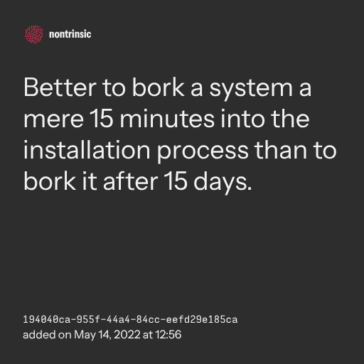 π€ shareBetter to bork a system a mere 15 minutes into the installation process than to bork it after 15 days.