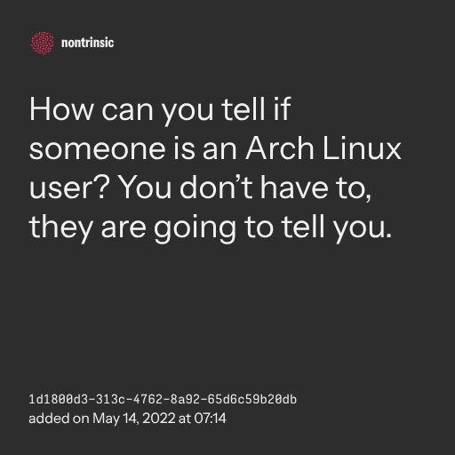 π€ shareHow can you tell if someone is an Arch Linux user? You don’t have to, they are going to tell you.
