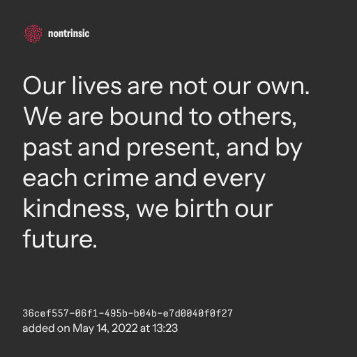 π€ shareOur lives are not our own. We are bound to others, past and present, and by each crime and every kindness, we birth our future.