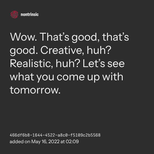 π€ shareWow. That’s good, that’s good. Creative, huh? Realistic, huh? Let’s see what you come up with tomorrow.