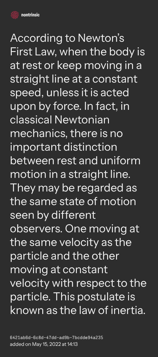 π€ shareAccording to Newton’s First Law, when the body is at rest or keep moving in a straight line at a constant speed, unless it is acted upon by force. In fact, in classical Newtonian mechanics, there is no important distinction between rest and uniform motion in a straight line. They may be regarded as the same state of motion seen by different observers. One moving at the same velocity as the particle and the other moving at constant velocity with respect to the particle. This postulate is known as the law of inertia.