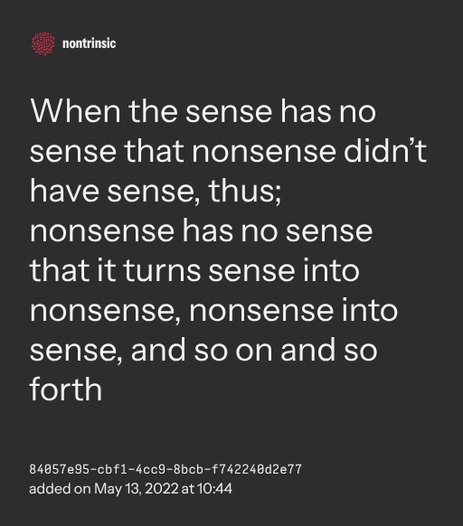 π€ shareWhen the sense has no sense that nonsense didn’t have sense, thus; nonsense has no sense that it turns sense into nonsense, nonsense into sense, and so on and so forth