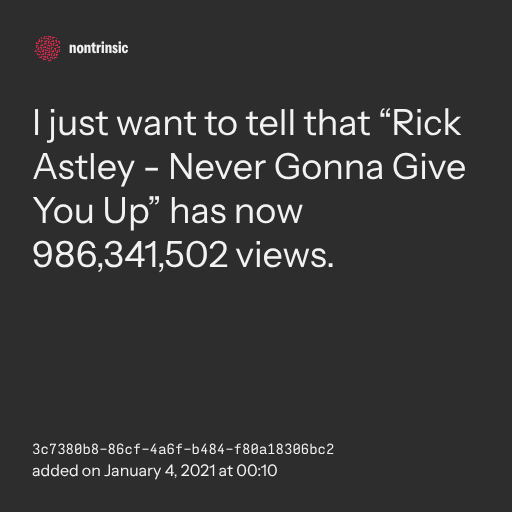 π€ shareI just want to tell that “Rick Astley - Never Gonna Give You Up” has now 986,341,502 views.