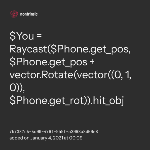 π€ share$You = Raycast($Phone.get_pos, $Phone.get_pos + vector.Rotate(vector((0, 1, 0)), $Phone.get_rot)).hit_obj