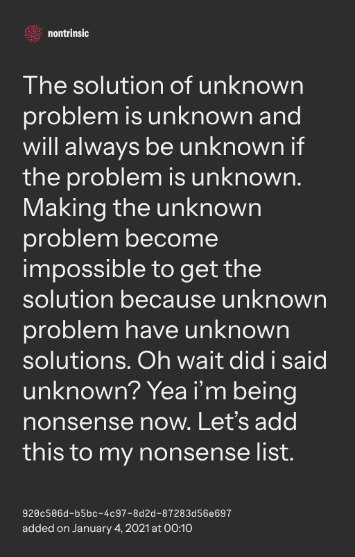 π€ shareThe solution of unknown problem is unknown and will always be unknown if the problem is unknown. Making the unknown problem become impossible to get the solution because unknown problem have unknown solutions. Oh wait did i said unknown? Yea i’m being nonsense now. Let’s add this to my nonsense list.