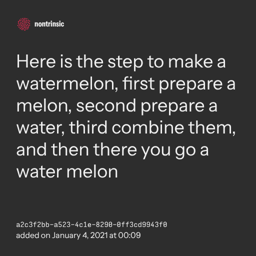 π€ shareHere is the step to make a watermelon, first prepare a melon, second prepare a water, third combine them, and then there you go a water melon