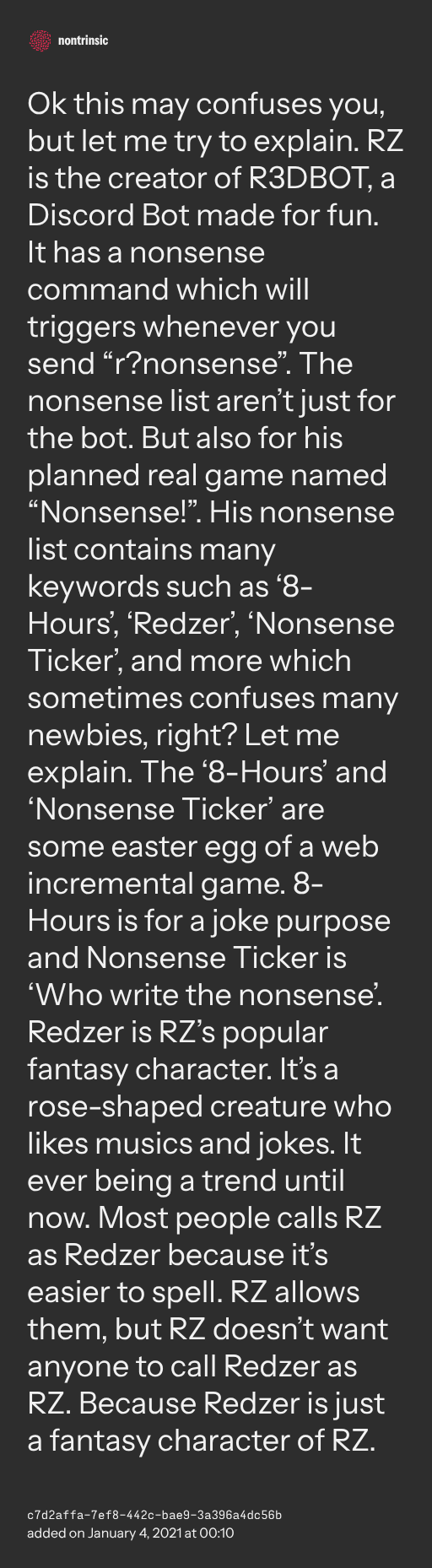 π€ shareOk this may confuses you, but let me try to explain. RZ is the creator of R3DBOT, a Discord Bot made for fun. It has a nonsense command which will triggers whenever you send “r?nonsense”. The nonsense list aren’t just for the bot. But also for his planned real game named “Nonsense!”. His nonsense list contains many keywords such as ‘8-Hours’, ‘Redzer’, ‘Nonsense Ticker’, and more which sometimes confuses many newbies, right? Let me explain. The ‘8-Hours’ and ‘Nonsense Ticker’ are some easter egg of a web incremental game. 8-Hours is for a joke purpose and Nonsense Ticker is ‘Who write the nonsense’. Redzer is RZ’s popular fantasy character. It’s a rose-shaped creature who likes musics and jokes. It ever being a trend until now. Most people calls RZ as Redzer because it’s easier to spell. RZ allows them, but RZ doesn’t want anyone to call Redzer as RZ. Because Redzer is just a fantasy character of RZ.
