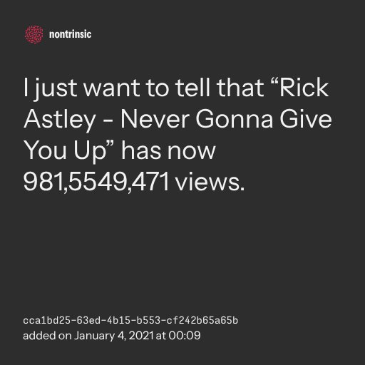 π€ shareI just want to tell that “Rick Astley - Never Gonna Give You Up” has now 981,5549,471 views.