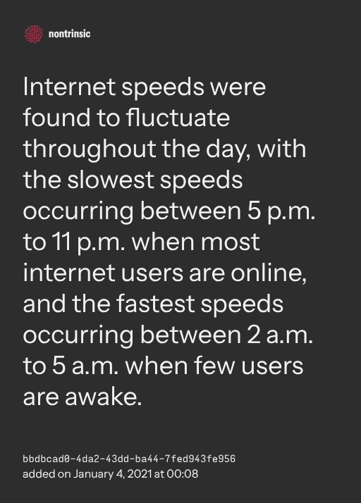 π€ shareInternet speeds were found to fluctuate throughout the day, with the slowest speeds occurring between 5 p.m. to 11 p.m. when most internet users are online, and the fastest speeds occurring between 2 a.m. to 5 a.m. when few users are awake.