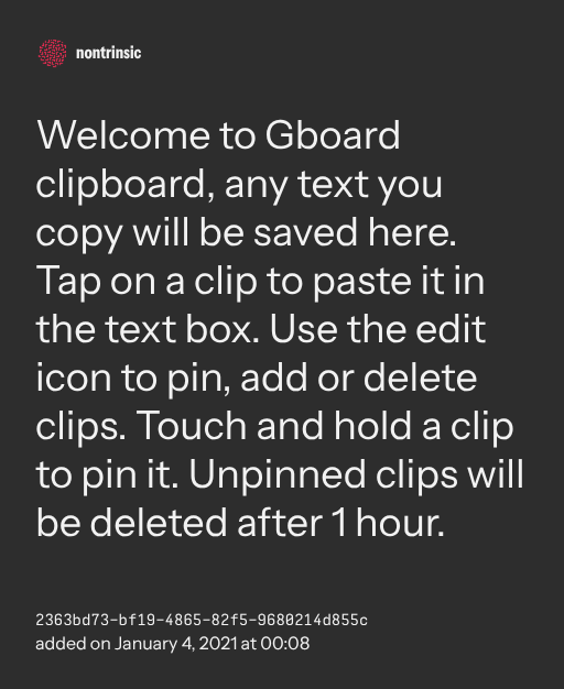 π€ shareWelcome to Gboard clipboard, any text you copy will be saved here. Tap on a clip to paste it in the text box. Use the edit icon to pin, add or delete clips. Touch and hold a clip to pin it. Unpinned clips will be deleted after 1 hour.