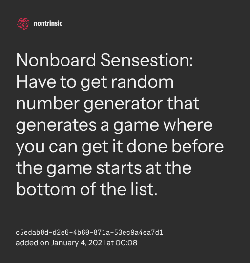 π€ shareNonboard Sensestion: Have to get random number generator that generates a game where you can get it done before the game starts at the bottom of the list.