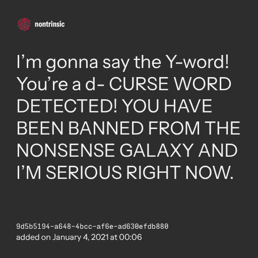 π€ shareI’m gonna say the Y-word! You’re a d- CURSE WORD DETECTED! YOU HAVE BEEN BANNED FROM THE NONSENSE GALAXY AND I’M SERIOUS RIGHT NOW.