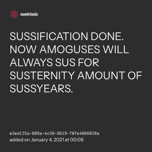 π€ shareSUSSIFICATION DONE. NOW AMOGUSES WILL ALWAYS SUS FOR SUSTERNITY AMOUNT OF SUSSYEARS.