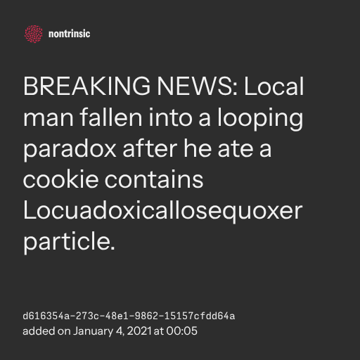 π€ shareBREAKING NEWS: Local man fallen into a looping paradox after he ate a cookie contains Locuadoxicallosequoxer particle.