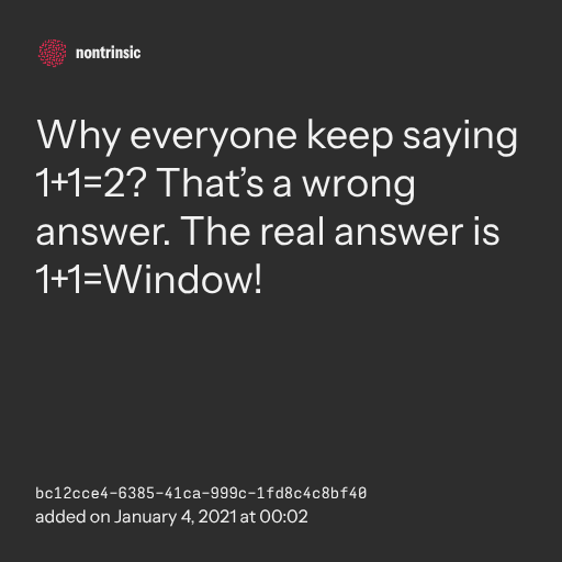 π€ shareWhy everyone keep saying 1+1=2? That’s a wrong answer. The real answer is 1+1=Window!