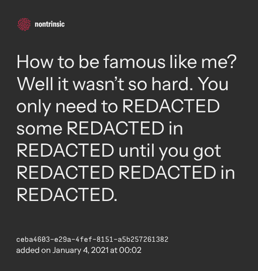 π€ shareHow to be famous like me? Well it wasn’t so hard. You only need to REDACTED some REDACTED in REDACTED until you got REDACTED REDACTED in REDACTED.