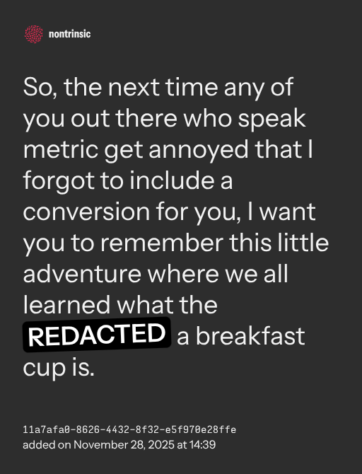 π€ shareSo, the next time any of you out there who speak metric get annoyed that I forgot to include a conversion for you, I want you to remember this little adventure where we all learned what the REDACTED a breakfast cup is.