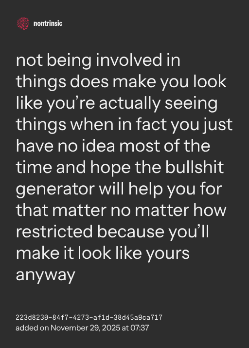 not being involved in things does make you look like you’re actually seeing things when in fact you just have no idea most of the time and hope the bullshit generator will help you for that matter no matter how restricted because you’ll make it look like yours anyway