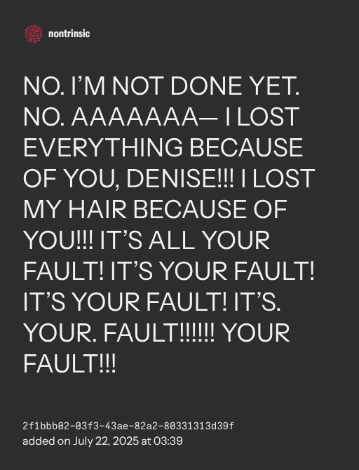 📤 shareNO. I’M NOT DONE YET. NO. AAAAAAA— I LOST EVERYTHING BECAUSE OF YOU, DENISE!!! I LOST MY HAIR BECAUSE OF YOU!!! IT’S ALL YOUR FAULT! IT’S YOUR FAULT! IT’S YOUR FAULT! IT’S. YOUR. FAULT!!!!!! YOUR FAULT!!!