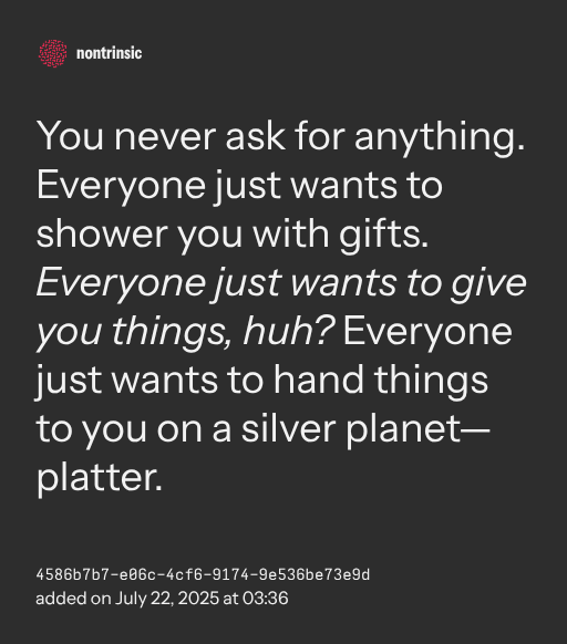 📤 shareYou never ask for anything. Everyone just wants to shower you with gifts. Everyone just wants to give you things, huh? Everyone just wants to hand things to you on a silver planet— platter.