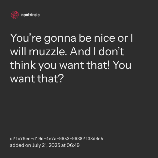 📤 shareYou’re gonna be nice or I will muzzle. And I don’t think you want that! You want that?