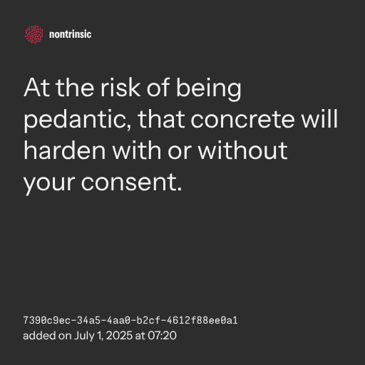📤 shareAt the risk of being pedantic, that concrete will harden with or without your consent.