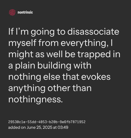 π€ shareIf I’m going to disassociate myself from everything, I might as well be trapped in a plain building with nothing else that evokes anything other than nothingness.