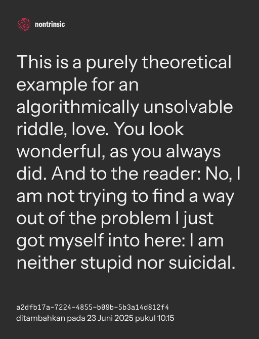 π€ shareThis is a purely theoretical example for an algorithmically unsolvable riddle, love. You look wonderful, as you always did. And to the reader: No, I am not trying to find a way out of the problem I just got myself into here: I am neither stupid nor suicidal.