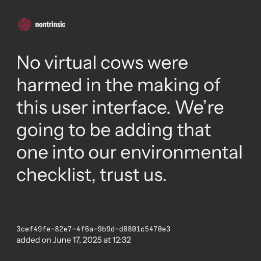 π€ shareNo virtual cows were harmed in the making of this user interface. We’re going to be adding that one into our environmental checklist, trust us.