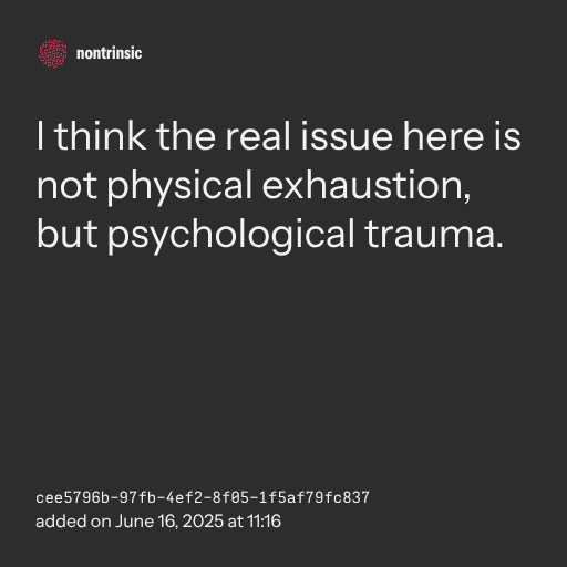 π€ shareI think the real issue here is not physical exhaustion, but psychological trauma.