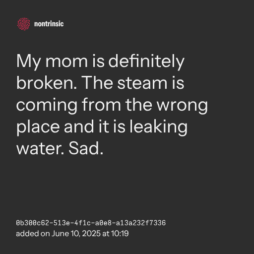 📤 shareMy mom is definitely broken. The steam is coming from the wrong place and it is leaking water. Sad.