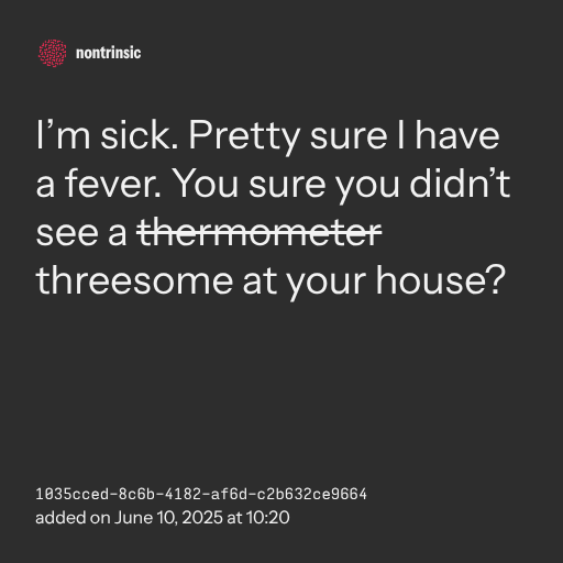📤 shareI’m sick. Pretty sure I have a fever. You sure you didn’t see a thermometer threesome at your house?