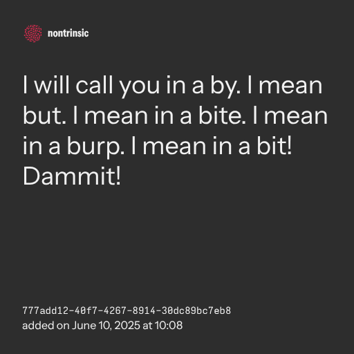 📤 shareI will call you in a by. I mean but. I mean in a bite. I mean in a burp. I mean in a bit! Dammit!