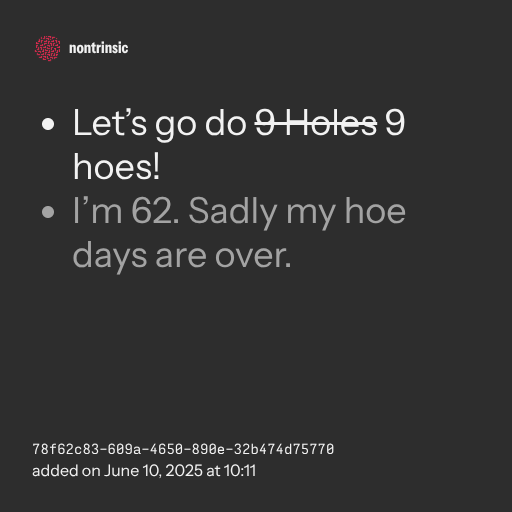 9 Holes9 hoes! - I’m 62. Sadly my hoe days are over.