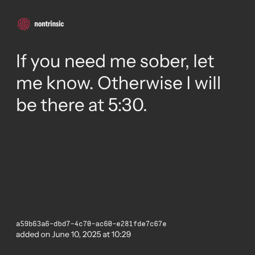 📤 shareIf you need me sober, let me know. Otherwise I will be there at 5:30.