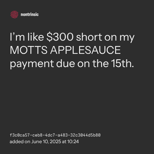 📤 shareI’m like $300 short on my MOTTS APPLESAUCE payment due on the 15th.