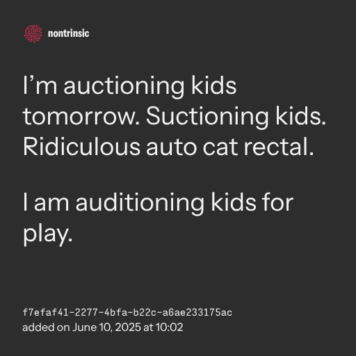 📤 shareI’m auctioning kids tomorrow. Suctioning kids. Ridiculous auto cat rectal.