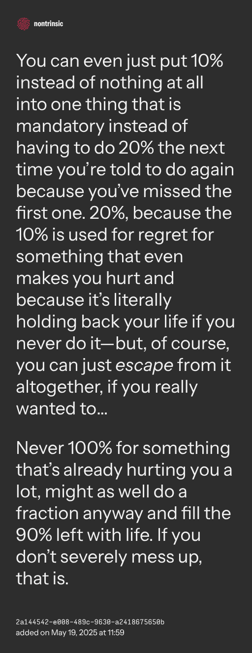 ๐ค shareYou can even just put 10% instead of nothing at all into one thing that is mandatory instead of having to do 20% the next time you’re told to do again because you’ve missed the first one. 20%, because the 10% is used for regret for something that even makes you hurt and because it’s literally holding back your life if you never do itโbut, of course, you can just escape from it altogether, if you really wanted toโฆ