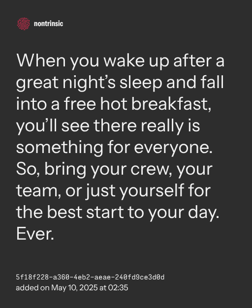 📤 shareWhen you wake up after a great night’s sleep and fall into a free hot breakfast, you’ll see there really is something for everyone. So, bring your crew, your team, or just yourself for the best start to your day. Ever.