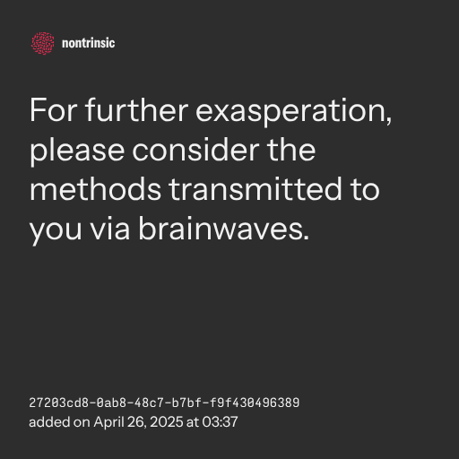 📤 shareFor further exasperation, please consider the methods transmitted to you via brainwaves.