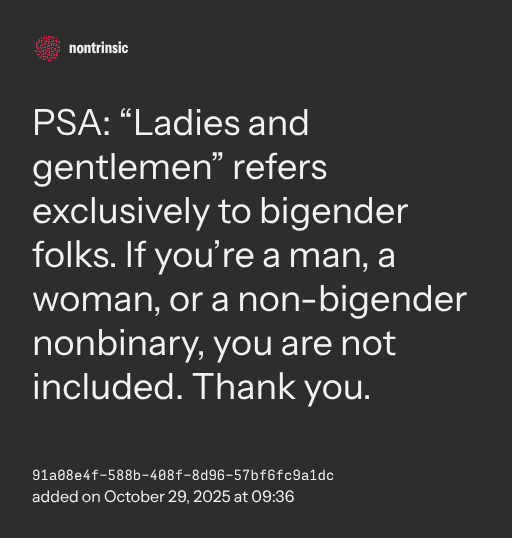 📤 sharePSA: “Ladies and gentlemen” refers exclusively to bigender folks. If you’re a man, a woman, or a non-bigender nonbinary, you are not included. Thank you.
