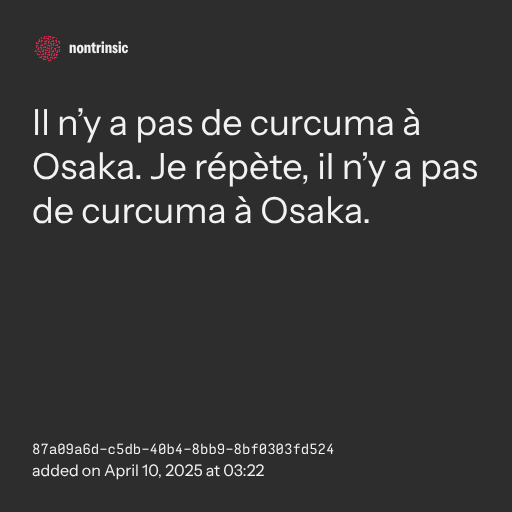 📤 shareIl n’y a pas de curcuma à Osaka. Je répète, il n’y a pas de curcuma à Osaka.