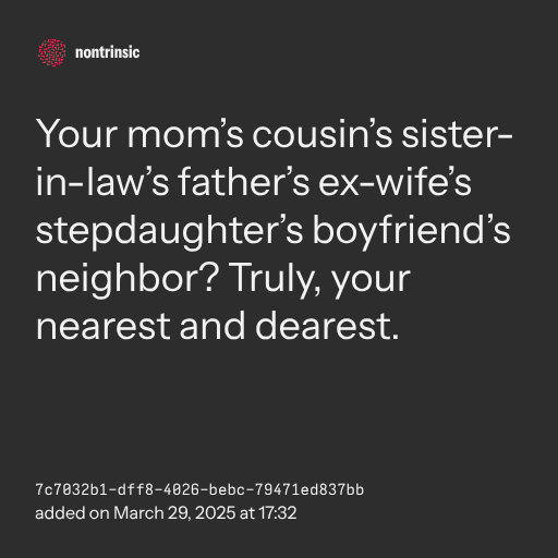 📤 shareYour mom’s cousin’s sister-in-law’s father’s ex-wife’s stepdaughter’s boyfriend’s neighbor? Truly, your nearest and dearest.