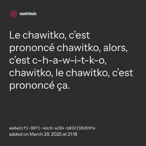 📤 shareLe chawitko, c’est prononcé chawitko, alors, c’est c-h-a-w-i-t-k-o, chawitko, le chawitko, c’est prononcé ça.