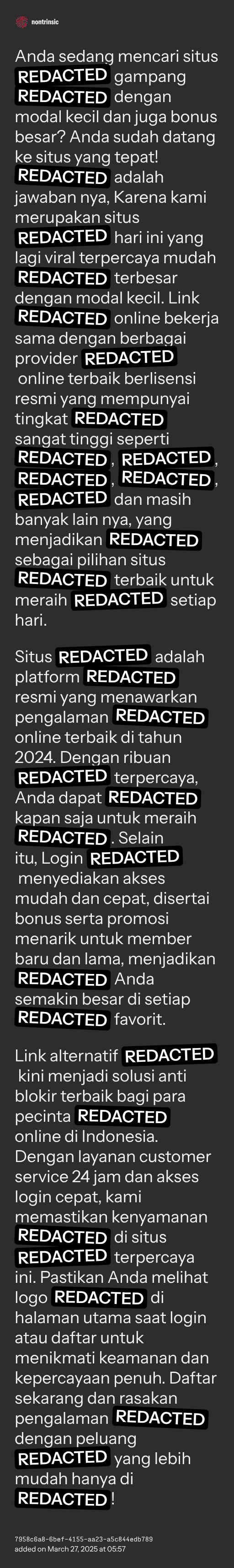 Situs REDACTED adalah platform REDACTED resmi yang menawarkan pengalaman REDACTED online terbaik di tahun 2024. Dengan ribuan REDACTED terpercaya, Anda dapat REDACTED kapan saja untuk meraih REDACTED. Selain itu, Login REDACTED menyediakan akses mudah dan cepat, disertai bonus serta promosi menarik untuk member baru dan lama, menjadikan REDACTED Anda semakin besar di setiap REDACTED favorit.